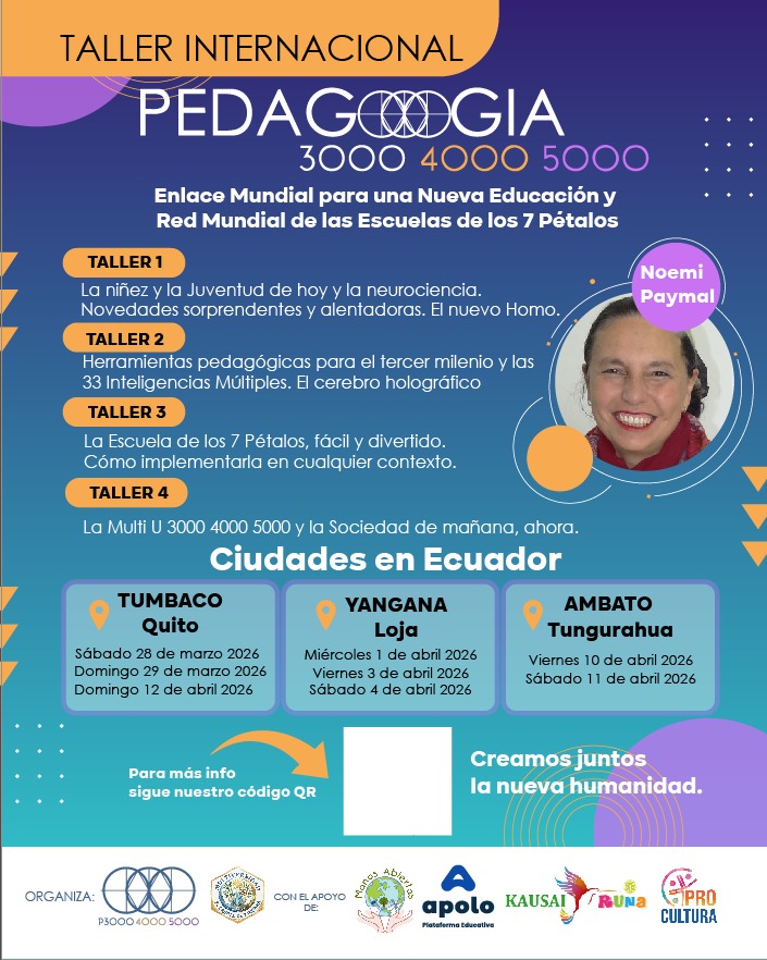 Hola, mi nombre es Noemi Paymal, soy antropóloga y presidenta de P3000, y tengo el honor de presentarles nuestros proyectos de Educatiooon/Pedagooogia 3000 4000 5000 para la Paz. Nuestro objetivo es contribuir a la reconstrucción conjunta de una nueva sociedad, basada en la cultura de la paz y la solidaridad, a través de una educación integral, proactiva y divertida.